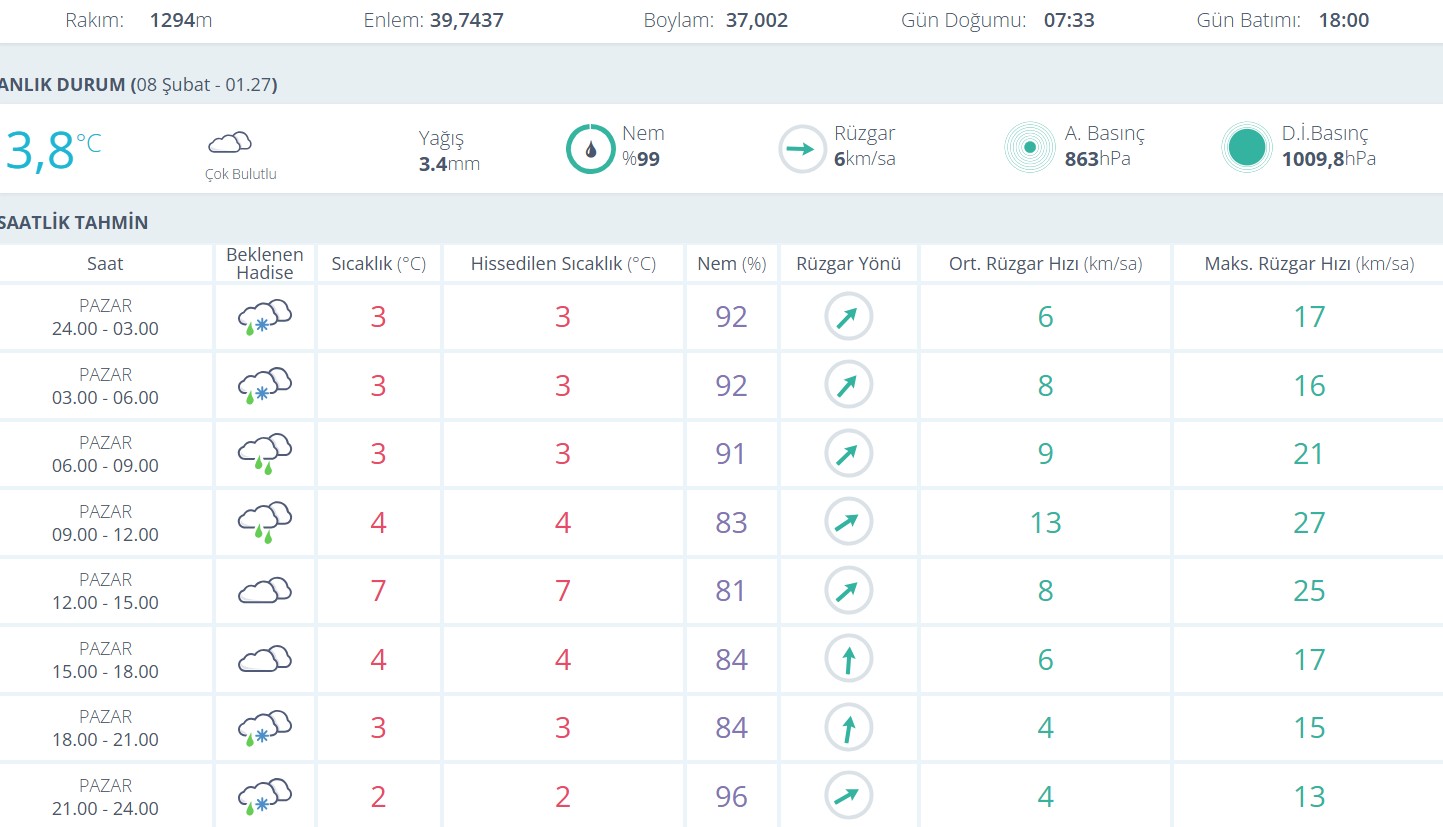 Saatlik tahminlere göre gece saatlerinden sabah saatlerine kadar sıcaklıkların 3 derece civarında seyretmesi beklenirken, sabah saatlerinde yağmur ve yer yer karla karışık yağmur ihtimalinin devam edeceği öngörülüyor. Öğle saatlerine doğru sıcaklıkların 7 dereceye kadar yükselmesi beklenirken, günün ilerleyen saatlerinde yeniden düşüşe geçerek akşam saatlerinde 3-4 derece seviyelerine gerilemesi tahmin ediliyor.