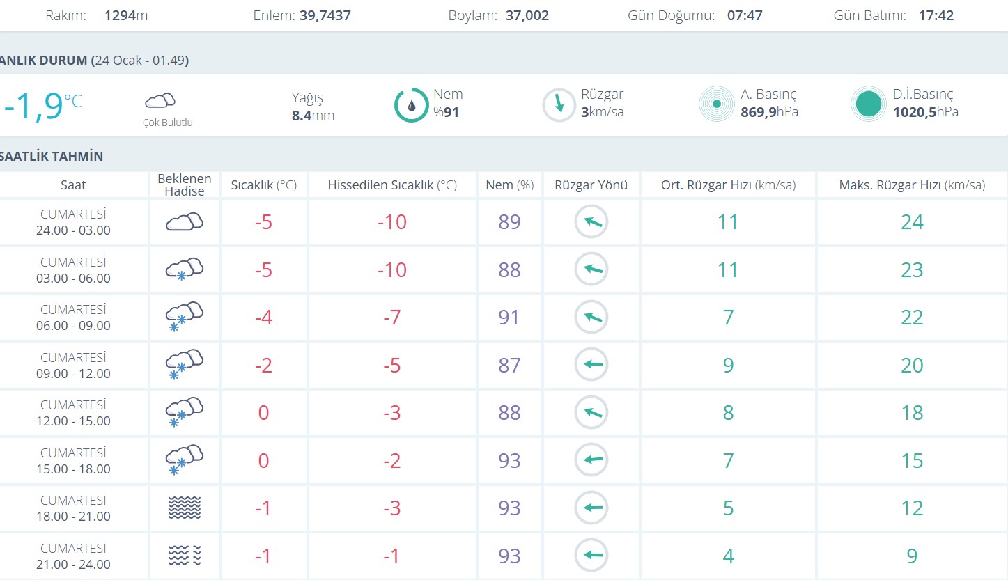 Saatlik tahminlere göre cumartesi günü gece 00.00 ile 06.00 saatleri arasında hava sıcaklığı -5 derece seviyelerinde seyrederken, hissedilen sıcaklık -10 dereceye kadar düşüyor. Bu saatlerde kar yağışı ve yer yer pus beklenirken, nem oranı yüzde 88-89 civarında olacak. Rüzgarın saatte 11 kilometre hızla esmesi, soğuğun daha keskin hissedilmesine yol açıyor.