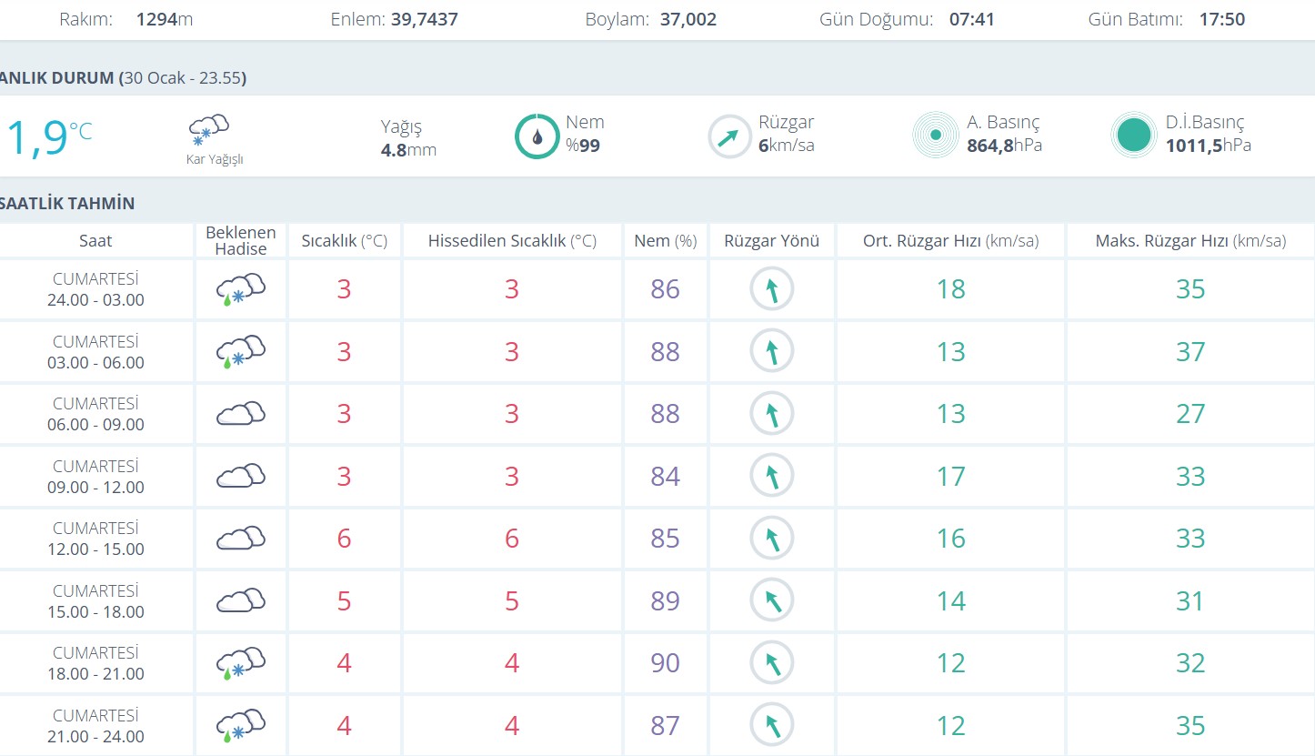 Saatlik tahminlere göre Cumartesi günü gece yarısından sabah saatlerine kadar karla karışık yağmurun aralıklarla devam etmesi bekleniyor. 24.00 ile 06.00 saatleri arasında hava sıcaklığının 3 derece civarında seyredeceği, nem oranının yüzde 86 ile 88 arasında olacağı öngörülüyor. Bu saat diliminde rüzgârın ortalama hızının 13 ila 18 kilometre, yer yer maksimum hızının ise 35-37 kilometreye kadar çıkabileceği belirtildi.