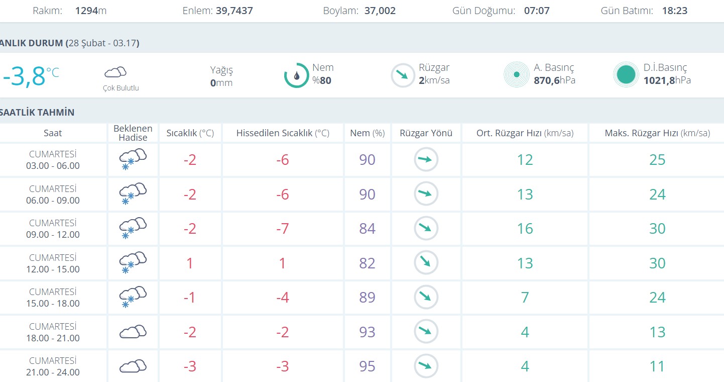 Saatlik tahminlere göre Cumartesi günü sabah saatlerinden itibaren kar yağışının aralıklarla etkili olması öngörülüyor. Sabah 03.00 ile 12.00 saatleri arasında hava sıcaklığının eksi 2 derece civarında seyretmesi beklenirken, hissedilen sıcaklığın rüzgarın etkisiyle eksi 6 ila eksi 7 dereceye kadar düşeceği tahmin ediliyor.