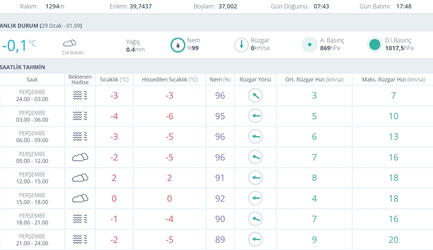 Gece yarısından itibaren başlayan puslu hava, özellikle sabah erken saatlerde görüş mesafesinin azalmasına neden oldu. Saat 01.09 itibarıyla hava sıcaklığı -0,1 derece olarak ölçülürken, nem oranının yüzde 99 seviyesine kadar yükselmesi dikkat çekti. Yağış miktarı düşük seviyede kalırken, yüksek nem ve puslu hava soğuk algısını artırdı.