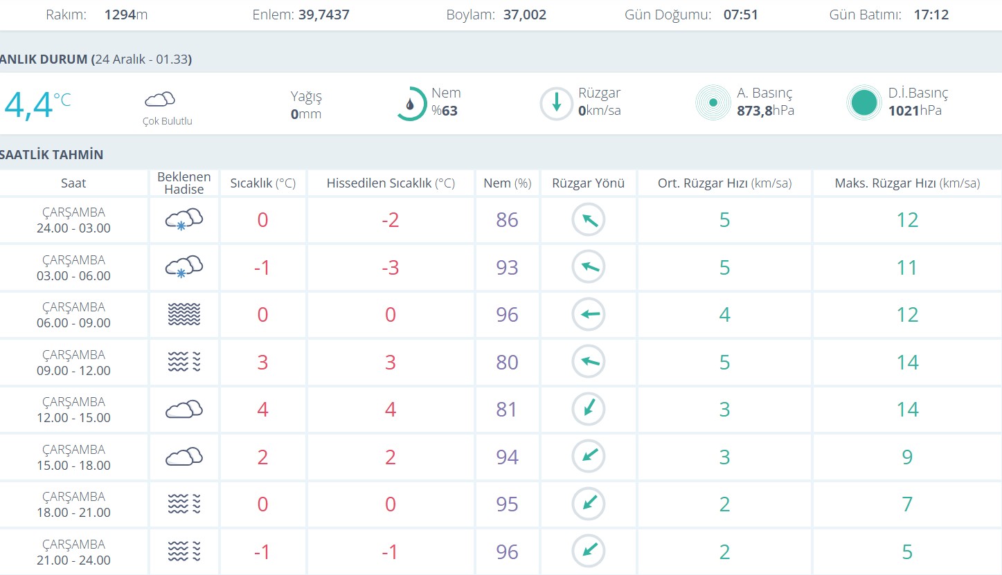 Saatlik tahminlere göre çarşamba günü gece yarısından sabaha kadar sıcaklıkların sıfırın altına düştüğü görüldü. 00.00–03.00 saatleri arasında sıcaklık 0 dereceye kadar gerilerken hissedilen sıcaklık eksi 2 derece oldu. 03.00–06.00 saatleri arasında ise sıcaklık eksi 1 dereceye düşerken hissedilen sıcaklık eksi 3 dereceye kadar indi. Bu saatlerde nem oranının yüzde 90’ın üzerine çıkması, özellikle sis ve pus oluşumunu artırdı.