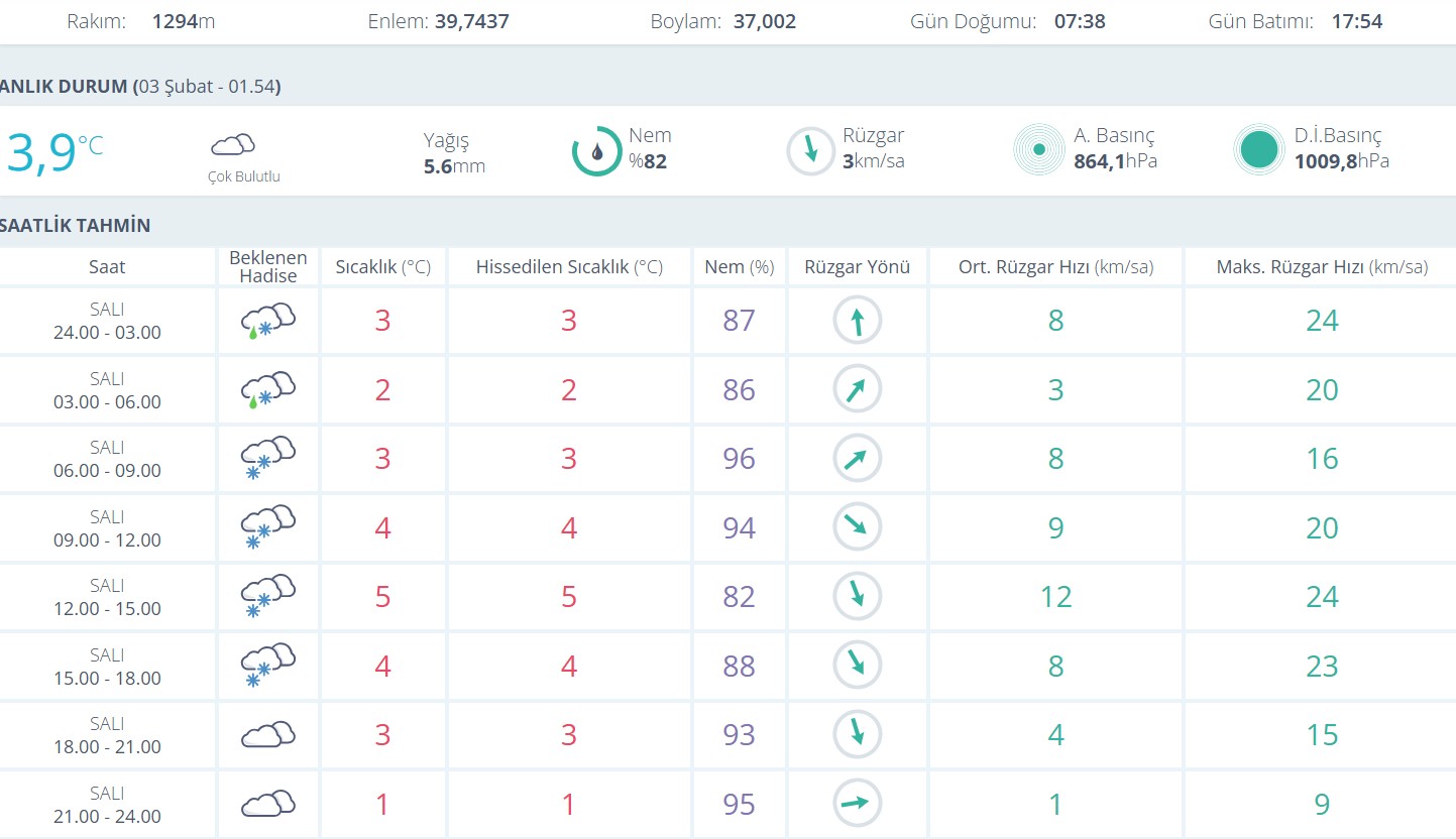 Sabah 06.00 ile 12.00 saatleri arasında karla karışık yağmurun yer yer etkisini sürdürmesi öngörülüyor. Öğle saatlerine doğru sıcaklık 4 ila 5 dereceye kadar yükselirken, rüzgar hızında artış yaşanacağı tahmin ediliyor. Özellikle 12.00–15.00 saatleri arasında rüzgarın zaman zaman saatte 24 kilometreye kadar çıkabileceği bildirildi.