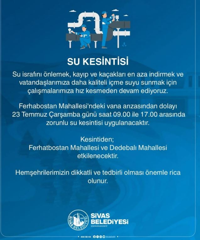 Sivas Belediyesi, Ferhatbostan Mahallesi'nde meydana gelen vana arızası nedeniyle 23 Temmuz 2025 Çarşamba günü zorunlu su kesintisi uygulanacağını duyurdu.