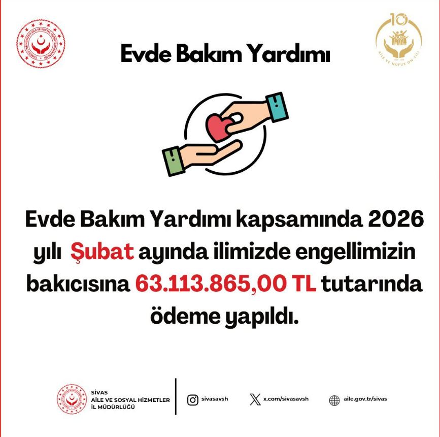 Evde bakım yardımı, özellikle engelli bireylerin aile ortamında bakımının sürdürülebilmesi açısından büyük önem taşıyor. Sivas’ta yapılan bu destek ödemesiyle hem bakım veren ailelerin yükü hafifletildi hem de sosyal destek mekanizmasının etkinliği bir kez daha ortaya kondu.