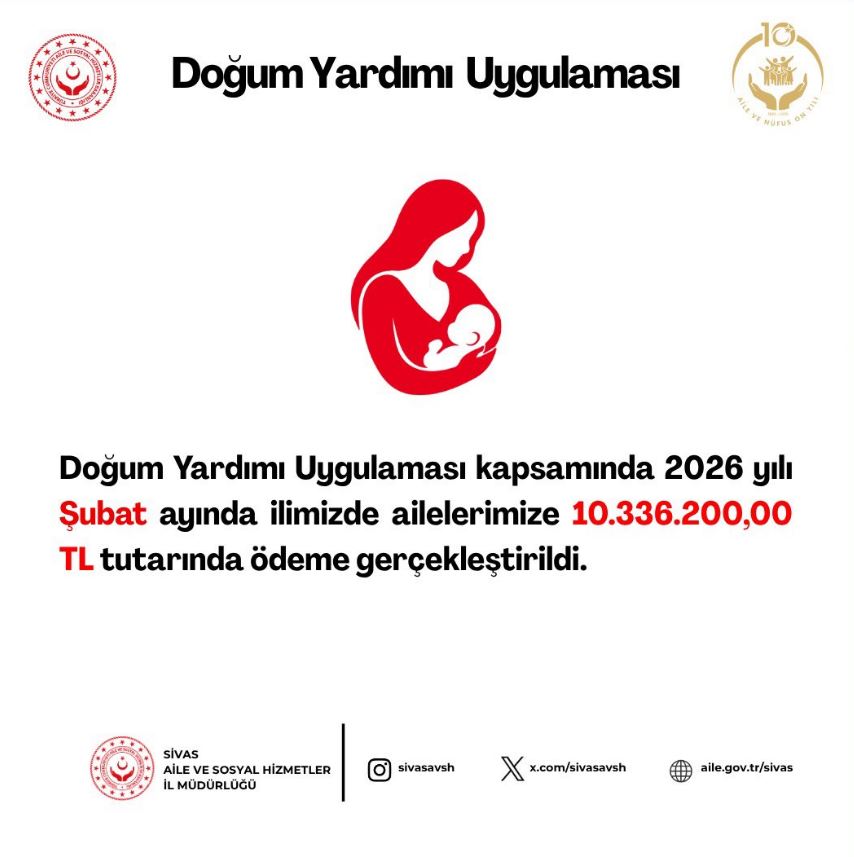 Öte yandan doğum yardımı uygulaması kapsamında da Sivas genelinde ailelere 10 milyon 336 bin 200 TL ödeme yapıldı. Yeni doğan çocuklar için verilen bu destek, aile bütçesine katkı sağlarken sosyal devlet anlayışının bir yansıması olarak değerlendiriliyor.