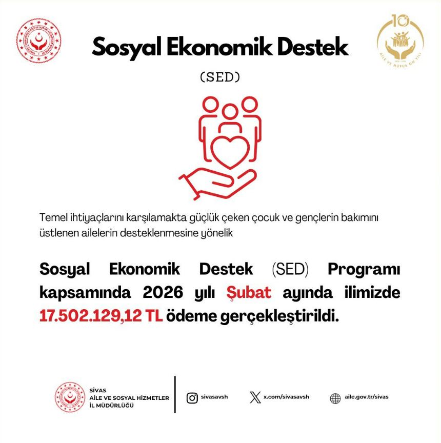 Sivas’ta Şubat Ayında Sosyal Destek Ödemeleri 90 Milyon TL’yi Aştı.. Sivas’ta Aile ve Sosyal Hizmetler İl Müdürlüğü tarafından yürütülen sosyal destek programları kapsamında 2026 yılı Şubat ayında toplamda 90 milyon lirayı aşan ödeme gerçekleştirildi.