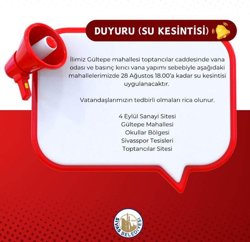 Sivas’ta 4 Eylül Sanayi, Gültepe, Okullar Bölgesi, Sivasspor Tesisleri ve Toptancılar Sitesi olmak üzere beş bölgede bugün su kesintisi yaşandı. Sabah saatlerinde başlayan kesinti, şehirdeki birçok işletmeyi ve bölge sakinini etkiledi.