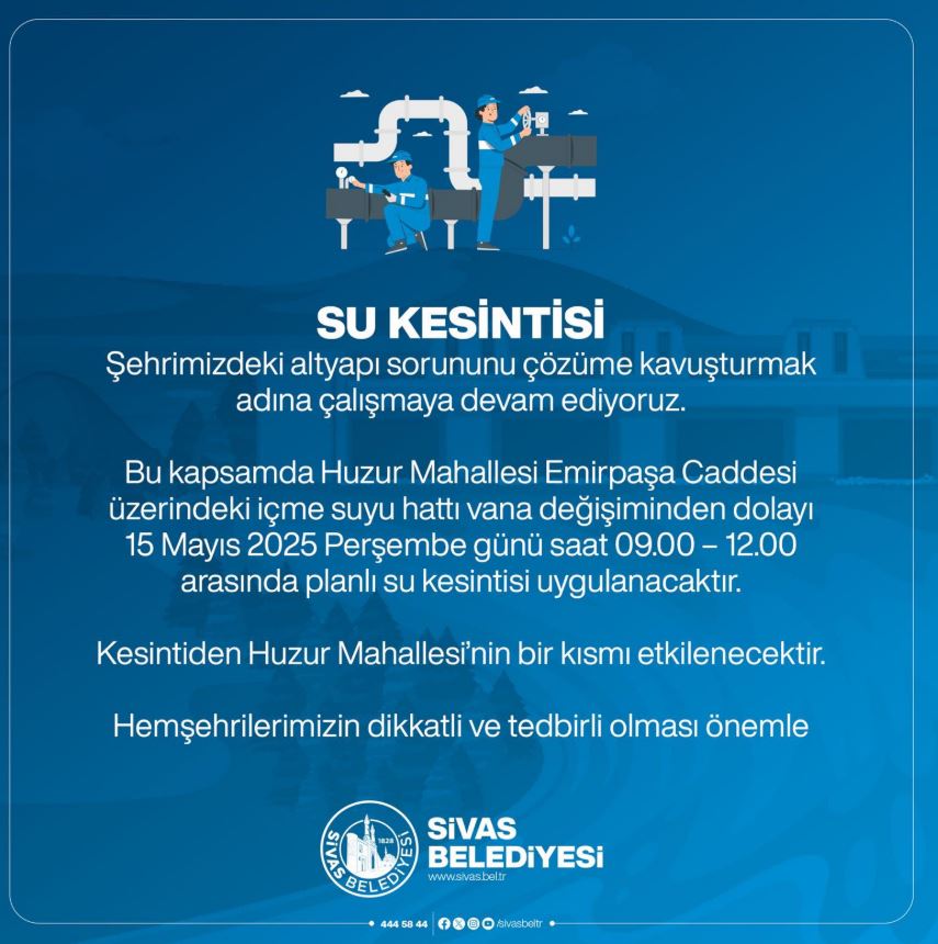 Sivas Belediyesi tarafından yapılan açıklamaya göre, şehirde altyapı çalışmalarının sürdüğü Huzur Mahallesi'nde 15 Mayıs 2025 Perşembe günü planlı su kesintisi uygulanacak.