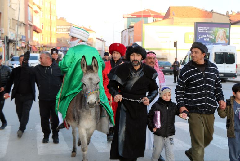Çarşı merkezinde de bir süre eşeğine ters binerek dolaşan temsili Nasreddin Hoca, esnafların ve vatandaşların Regaip Kandili'ni tebrik etti.