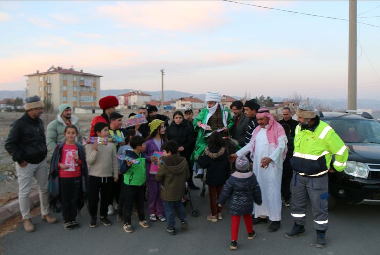 Temsili Nasreddin Hoca'yı canlandıran Mehmet Sığırcı, eşeğiyle Kale Mahallesi'ni gezerek çocuklara hediye dağıttı.