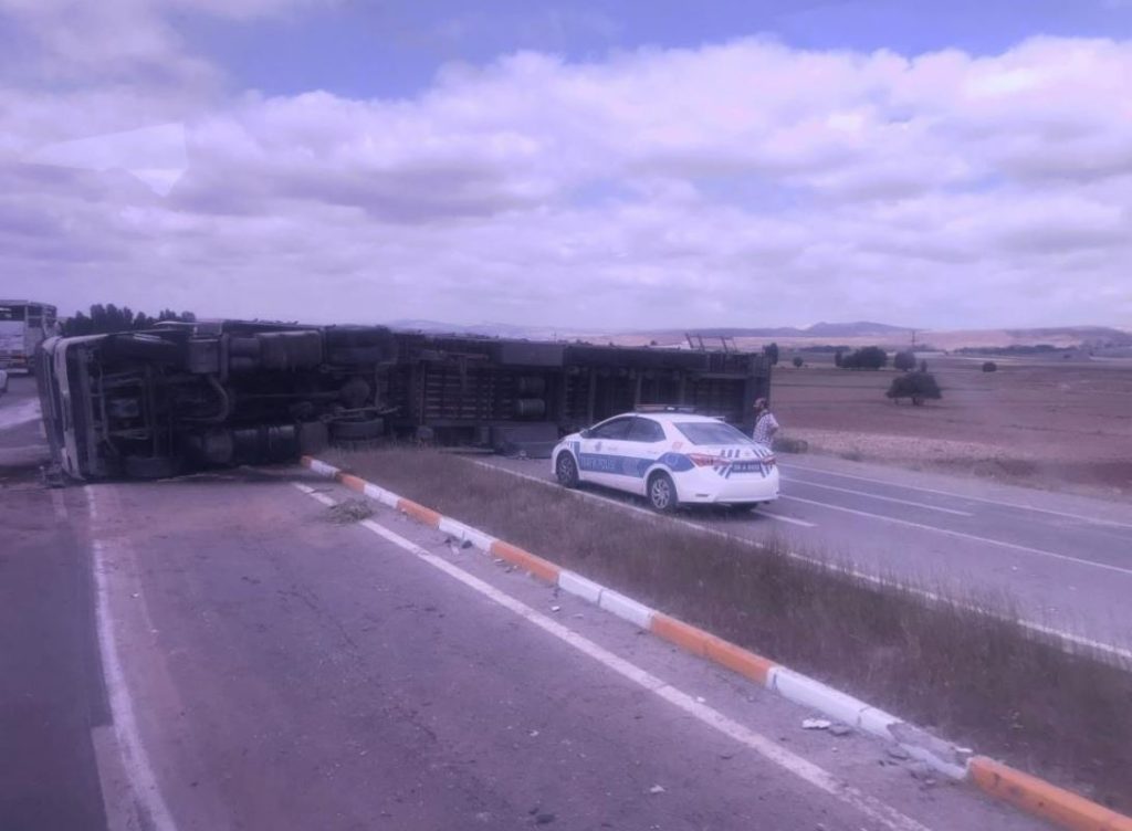 Edinilen bilgilere göre kaza Sivas-Kayseri karayolu Kayadibi mevkiinde meydana geldi. Sürücüsü öğrenilemeyen 27 AEF 640 plakalı tır sürücüsünün hakimiyetini kaybetmesi sonucu yan yattı. Kazada saman balyaları yola saçılırken Sivas yönü bir süreliğine trafiğe kapandı. Sürücü kazayı yara almadan atlattı. Tırın kaldırılmasıyla yol yeniden ulaşıma açıldı. Kaza ile ilgili inceleme başlatıldı. (İHA)