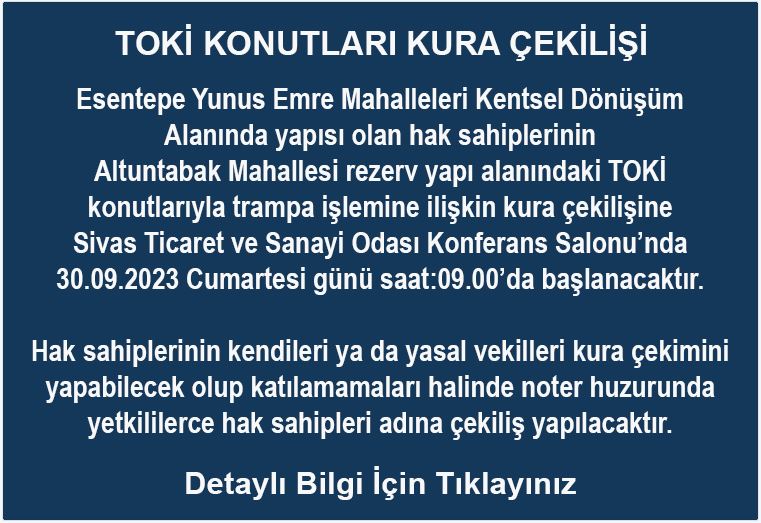 Belediye Başkanlığı tarafından yapılan açıklamda: " TOKİ konutlarıyla trampa işlemine ilişkin kura çekilişine Sivas Ticaret ve Sanayi Odası Konferans Salonu'nda 30.09.2023 Cumartesi günü saat 09:00'da başlanacaktır." ifadelerine yer verildi.