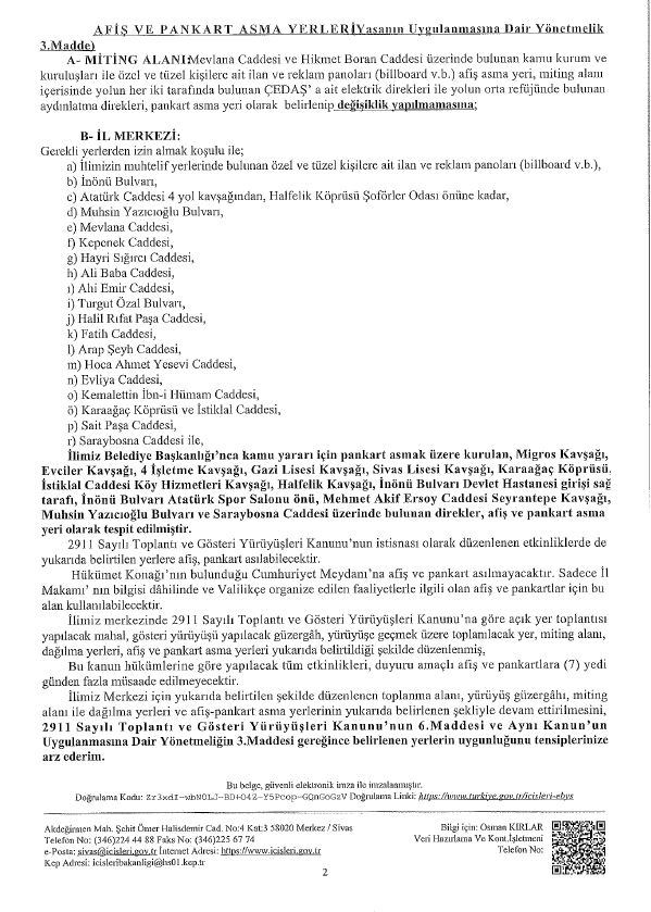 Sivas'ta Toplantı ve Gösteri Yürüyüşü Güzergahı ile Afiş ve Pankart Asılacak Yerler Belirlendi!
