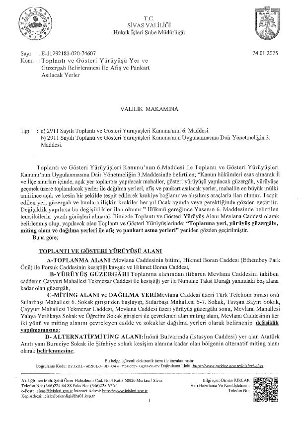 Sivas Valiliği, 2911 Sayılı Toplantı ve Gösteri Yürüyüşleri Kanunu çerçevesinde, toplantı ve gösteri yürüyüşü güzergahı ile afiş ve pankart asılacak yerleri açıkladı. Alınan kararların amacı, toplantıların ve gösterilerin kamu düzenine uygun bir şekilde gerçekleşmesini sağlamak.
