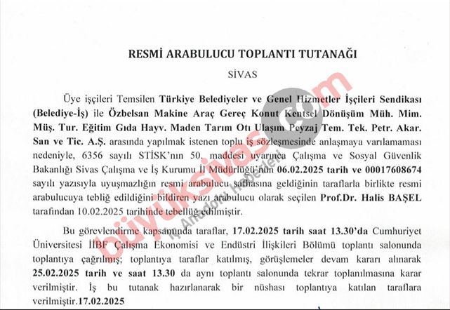 Sivas’ta Türkiye Belediyeler ve Genel Hizmetler İşçileri Sendikası (Belediye-İş) ile ÖzbelSan A.Ş. arasında yapılan toplu iş sözleşmesi görüşmelerinde anlaşmaya varılamaması üzerine, süreç resmi arabulucu safhasına taşındı.