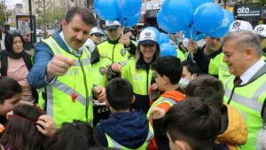 Vali Ayhan programa gelen çocuklarla yaya geçidinden geçerek balon ve düdük dağıttı. Program alanına kurulan Çocuk Trafik Eğitim Parkında çocuklar doyasıya eğlendi. Vali Ayhan, alanda bulunan İl Jandarma Trafik ekiplerine ait motosiklete bindi.