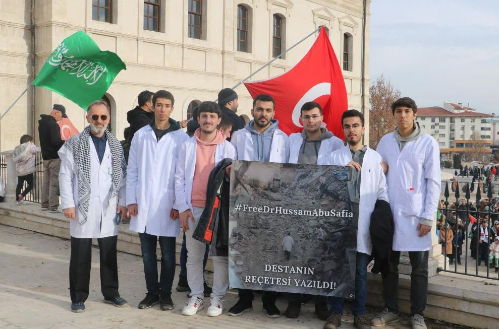 Sivas'ta Üniversite tıp fakültesi öğrencilerinin öncülüğünde üniversite öğrencileri, İsrail'in Filistin'de başta hastanelere yönelik olmak üzere olmak üzere tüm saldırılarını kınadı.
