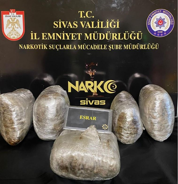 Sivas’ta Cumhuriyet Başsavcılığı koordinesinde Sivas İl Emniyet Müdürlüğü, Narkotik Suçlarla Mücadele Şube Müdürlüğü ve İstihbarat Şube Müdürlüğü ekipleri tarafından Kayseri Caddesi üzerinde durdurulan bir araçta yapılan arama ve kontrollerde 5 paket halinde toplam daralı ağırlığı 5 kilo 600 gram Esrar maddesi ele geçirildi. Araçta bulunan iki şüpheli gözaltına alındı. Şüpheler emniyetteki işlemlerinin ardından çıkartıldıkları adli makamlarca tutuklanarak cezaevine gönderildi.-iha