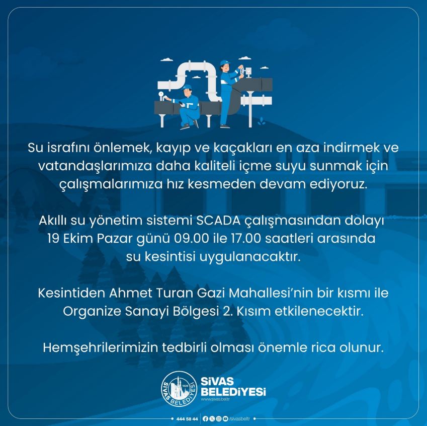 Sivas Belediyesi tarafından yapılan açıklamalarda, su kesintilerinin SCADA akıllı su yönetim sistemi çalışmaları nedeniyle yaşandığı ifade edilirken, vatandaşlar kesintilerin sıklaşmasından dolayı mağdur olduklarını belirtiyor. Özellikle Ahmet Turan Gazi Mahallesi, Organize Sanayi Bölgesi ve çevresinde yaşayan vatandaşlar, suyun saatlerce akmaması nedeniyle günlük ihtiyaçlarını karşılamakta zorlandıklarını dile getirdi.