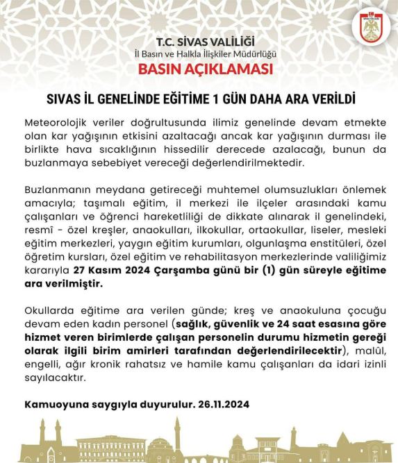 Yapılan açıklamayla Sivas'ta  27 Kasım 2024 Çarşamba günü bir (1) gün süreyle eğitime ara verildi.