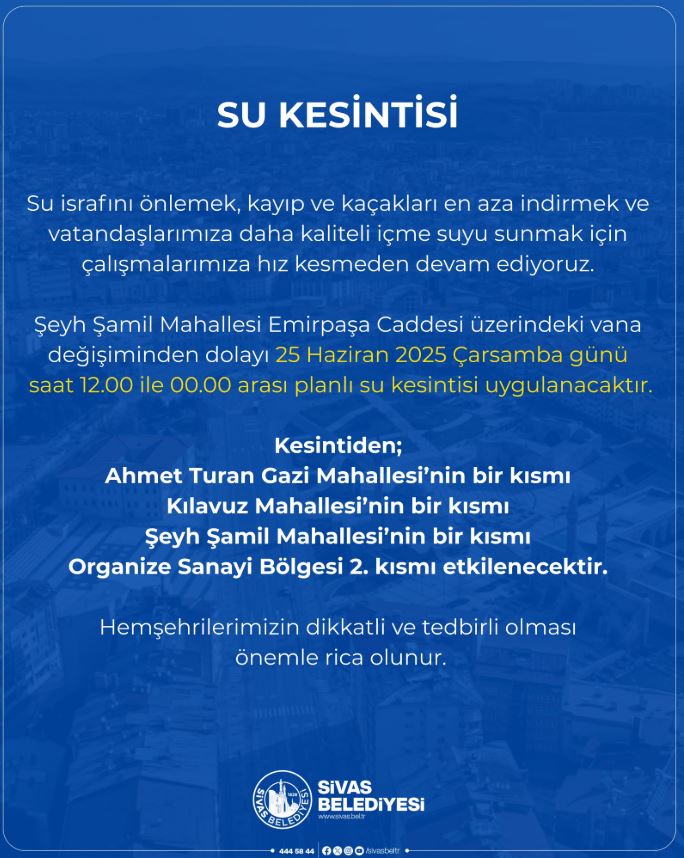 Sivas Belediyesi, Şeyh Şamil Mahallesi Emirpaşa Caddesi üzerinde yapılacak vana değişimi nedeniyle 25 Haziran 2025 Çarşamba günü saat 12.00 ile 00.00 arasında bazı bölgelerde planlı su kesintisi uygulanacağını duyurdu.