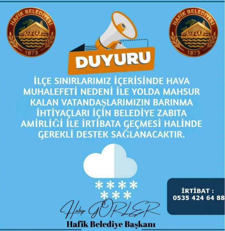 Hafik Belediye Başkanı Habip Görler, sosyal medya üzerinden yaptığı bilgilendirmede vatandaşlara çağrıda bulunarak, “Olumsuz hava şartları nedeniyle mağduriyet yaşanması halinde belediyemizle irtibata geçin. Tüm imkânlarımızla yanınızdayız.” mesajını paylaştı.