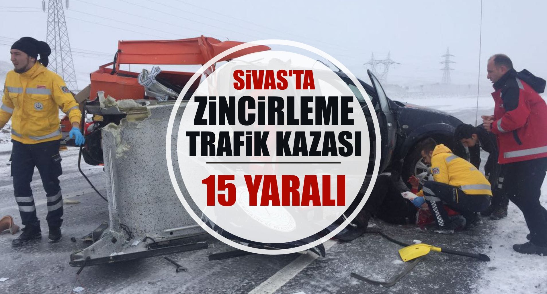 Sivas'ın Kangal ilçesinde, kar ve tipi nedeniyle meydana gelen zincirleme trafik kazasında ilk belirlemelere göre, 15 kişi yaralandı.