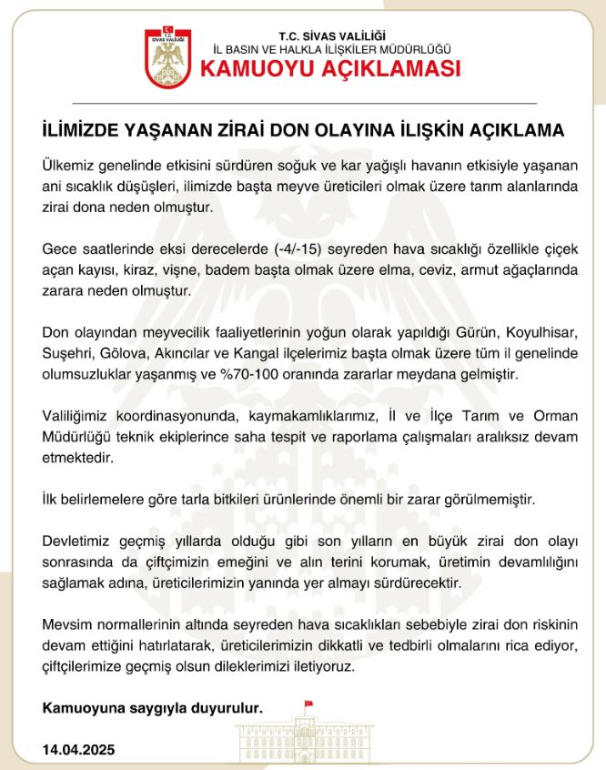 Sivas Valiliği, İl Tarım ve Orman Müdürlüğü ile ilgili kurumlara bağlı teknik ekipler, don olayından etkilenen bölgelerde detaylı incelemelere başladı. İlk değerlendirmelere göre, çiçeklenme döneminde olan kayısı, kiraz, vişne, badem, elma, ceviz ve armut ağaçlarında yüzde 70 ila 100 arasında zarar oluştu.