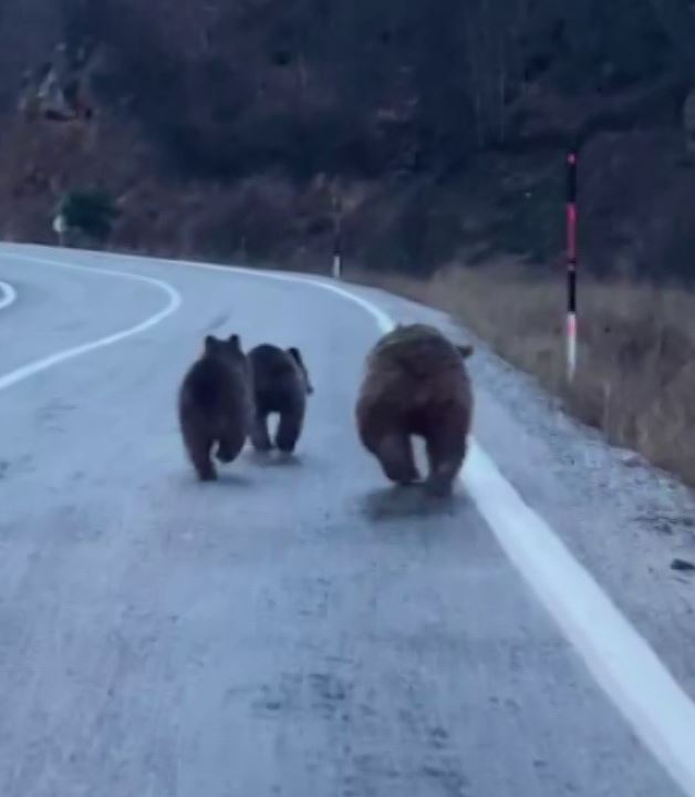 O anları kayda alan Bahadır Karataş, çok güzel görüntülerin olduğunu ifade ederek, "Doğanşar’dan Zara dönüş yolunda önümüze anne ayı ve iki yavrusu çıktı. Biz de onları videoya çektik. Herkes görsün istedik. Çok güzel bir görüntüydü. Daha sonra ayılar ormanın içine girerek kayboldular" dedi. (İHA)