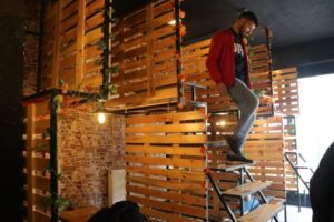 Özmen masaları çift katlı yapmayı düşündü. Geliştirdiği sistemle ortaya akıllara durgunluk veren raflı sistem çıktı. Şimdi müşterilerini adeta kitaplar gibi raflarda ağırlıyor. Özmen hem amacına ulaştı hem de dikkat çeken kafesi ile müşteri sayısını arttırdı.