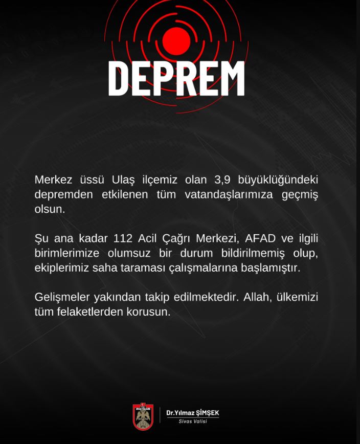 Sivas’ın Ulaş ilçesinde meydana gelen 3.9 büyüklüğündeki depremin ardından Sivas Valisi Dr. Yılmaz Şimşek, kamuoyuna yazılı bir açıklama yaptı.