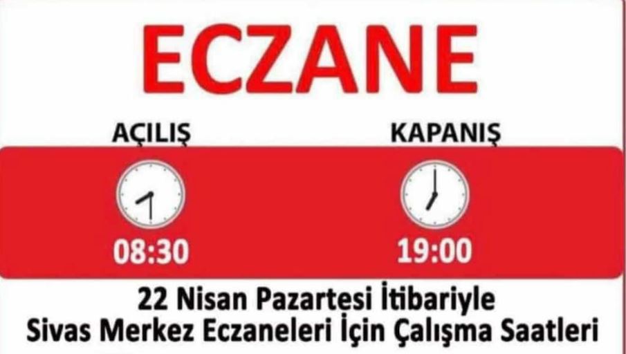 Sivas Eczacılar Odası tarafından yapılan açıklamada 22 Nisan 2024 pazartesi gününden itibaren Sivas Merkezde çalışan eczanelerin çalışma saatleri de düzenlendi.