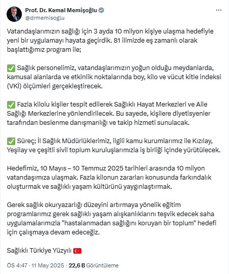 Sağlık Bakanı Kemal Memişoğlu, sosyal medya hesabından yaptığı açıklamayla yeni bir farkındalık programını duyurdu.