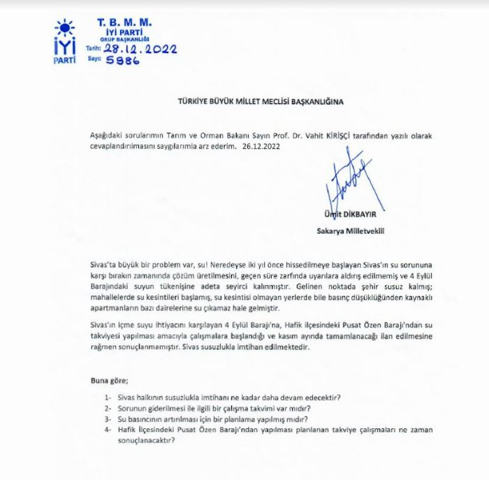 İYİ Parti Sivas ve Sivaslılarla yakından ilgilenmeye devam ediyor. İYİ Parti, Sivaslıların imtihanı haline gelen susuzluk sorununun peşini bırakmıyor. İYİ Parti Genel Başkan Yardımcısı ve Sakarya Milletvekili Ümit Dikbayır Sivas'ın su sorunuyla alakalı Tarım ve Orman Bakanı Vahit Kirişçi'nin cevaplaması isteğiyle TBMM Başkanlığına soru önergesi verdi.