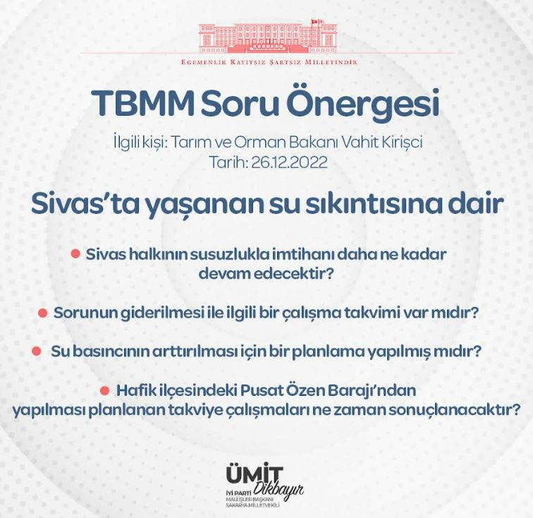 Ümit Dikbayır soru önergesinde Vahit Kirişçi'ye; "- Sivaslıların susuzlukla imtihanı daha ne kadar devam edecektir?