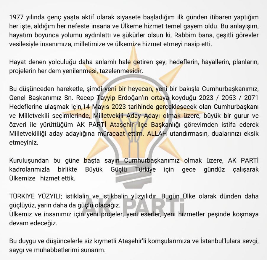 Başkan Erdem sosyal medya hesabından yaptığı açıklamada: "Ataşehir Ak Parti İlçe Başkanlığı görevimden bugün itibariyle istifa ederek 14 Mayıs’ta yapılacak seçimde Milletvekilliği aday adaylığı müraacatında bulundum. ALLAH hakkımızda hayırlı olanı versin, dualarınızı beklerim." ifadelerine yer verdi.