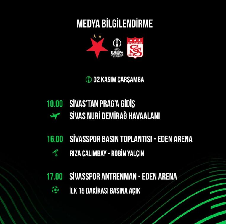 UEFA Avrupa Konferans Ligi'nde Slavia Prag ile oynanacak maç öncesinde DG Sivasspor'un medya programı belli oldu.