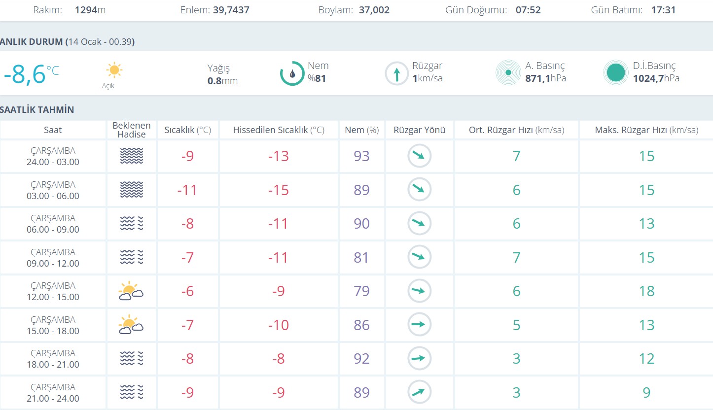 Gece yarısı itibarıyla kent merkezinde hava sıcaklığı -8,6 derece olarak ölçülürken, hissedilen sıcaklık daha da düşük seviyelere indi. Nem oranının yüzde 81’e kadar yükseldiği kentte rüzgar hızının düşük olmasına rağmen soğuk havanın etkisini artırdığı görüldü. Atmosfer basıncının 871,1 hPa, deniz seviyesine indirgenmiş basıncın ise 1024,7 hPa olduğu kaydedildi.