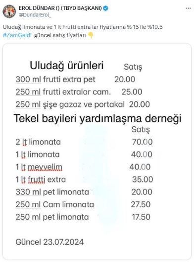 Tekel Bayileri Yardımlaşma Derneği Başkanı Erol Dündar, sosyal medya üzerinden yaptığı açıklamada, Uludağ Limonata ve Frutti Extra ürünlerine fiyat artışı yapıldığını açıkladı. Bu zam kararı, tüketiciler arasında büyük tepki çekerken yeni fiyat listesi de belli oldu.
