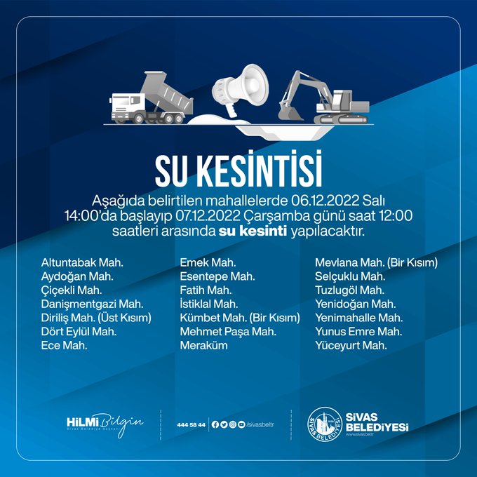 Sivas Belediyesi yaptığı açıklamada: ” 06.12.2022 Salı 14:00’da başlayıp 07.12.2022 Çarşamba günü Saat 12:00 saatleri arasında su kesintisi yapılacaktır.” ifadelerine yer verildi.