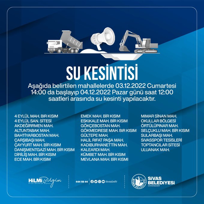 Sivas Belediyesi yaptığı açıklamada: " 03.12.2022 Cumartesi 14:00'da başlayıp 04.12.2022 Pazar günü Saat 12:00 saatleri arasında su kesintisi yapılacaktır." ifadelerine yer verildi.