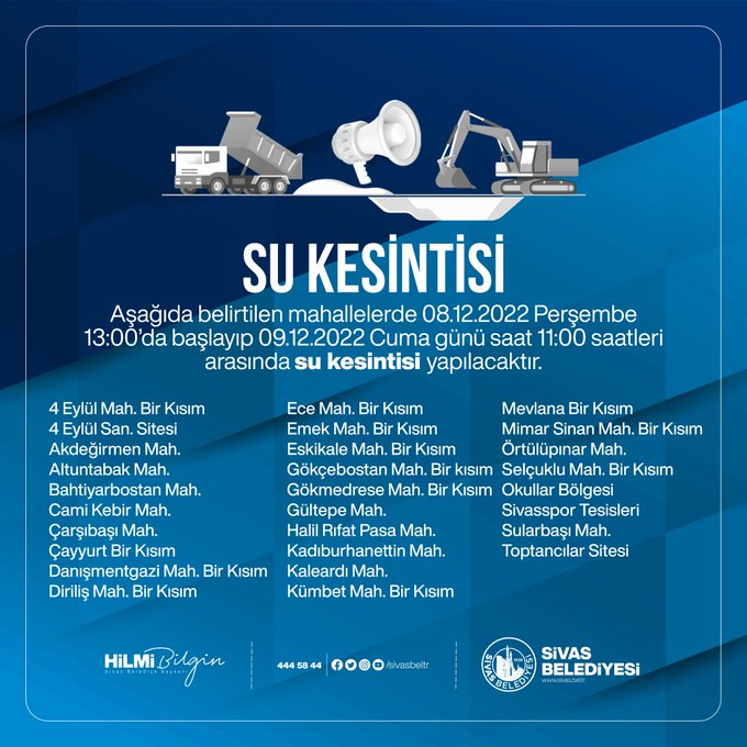 Sivas Belediyesi yaptığı açıklamada: ” 08.12.2022 Perşembe 13:00’da başlayıp 09.12.2022 Cuma günü Saat 11:00 saatleri arasında su kesintisi yapılacaktır.” ifadelerine yer verildi.