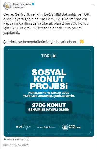 Yapılan açıklamada: "Çevre, Şehircilik ve İklim Değişikliği Bakanlığı ve TOKİ eliyle hayata geçirilen "İlk Evim, İlk İş Yerim" projesi kapsamında Sivas'a yapılacak olan 2 bin 706 konut için 16-17-18 Aralık 2022 tarihlerinde kura çekimi yapılacak.
