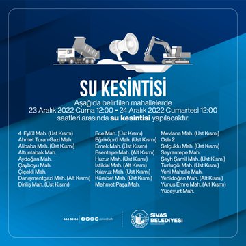 Sivas Belediyesi yaptığı açıklamada: ” 23.12.2022 Cuma 12:00’da başlayıp 24.12.2022 Cumartesi günü Saat 12:00 saatleri arasında su kesintisi yapılacaktır.” ifadelerine yer verildi.