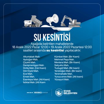 Sivas Belediyesi yaptığı açıklamada: ” 18.12.2022 Pazar 12:00’da başlayıp 19.12.2022 Pazartesi günü Saat 12:00 saatleri arasında su kesintisi yapılacaktır.” ifadelerine yer verildi.