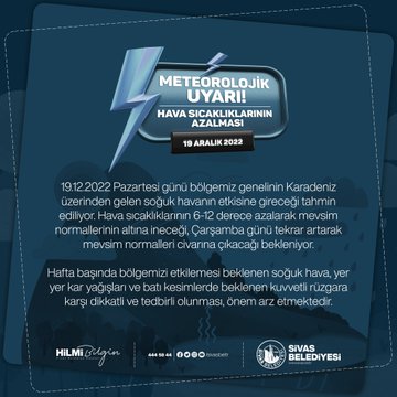 Sivas Belediyesi resmi hesabından yapılan açıklamada: "19.12.2022 Pazartesi günü bölgemiz genelinin Karadeniz üzerinden gelen soğuk havanın etkisine gireceği tahmin ediliyor. Hava sıcaklıklarının 6-12 derece azalarak mevsim normallerinin altına ineceği, çarşamba günü tekrar artarak mevsim normalleri civarına çıkacağı bekleniyor." ifadelerine yer verdi.