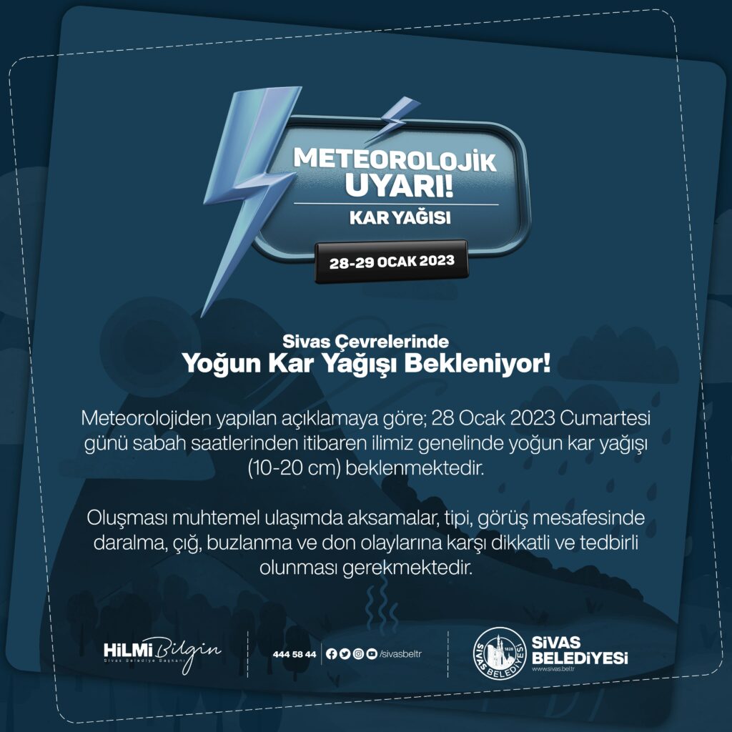 Sivas Belediyesi sosyal medya hesabından yaptığı açıklamada: ” 28 Ocak 2023 Cumartesi günü sabah saatlerinden itibaren ilimiz genelinde yoğun kar yağışı(10-20) beklenmektedir.” ifadelerine yer verildi.