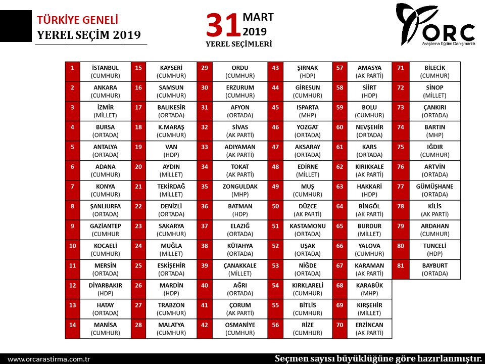 31 Mart yerel seçimlerine bir gün kala, 24 Haziran seçimlerinde yaptığı anketler ile en yakın tahminlere ulaşan araştırma şirketi ORC, elindeki son anketi paylaştı.