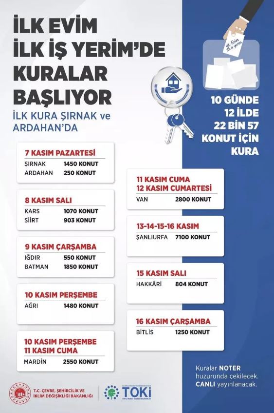 Ayrıca; 8 Kasım’da 1070 konut için Kars ve 903 konut için Siirt'te, 9 Kasım’da 550 konut için Iğdır ve 1850 konut için Batman'da, 10 Kasım’da 1480 konut için Ağrı'da, 10-11 Kasım’da 2 bin 550 konut için Mardin'de, 11-12 Kasım’da 2 bin 800 konut için Van'da, 13-14-15-16 Kasım’da 7 bin 100 konut için Şanlıurfa'da, 15 Kasım’da 804 konut için Hakkari'de ve 16 Kasım’da 1250 konut için Bitlis'te kura çekimi yapılacak.